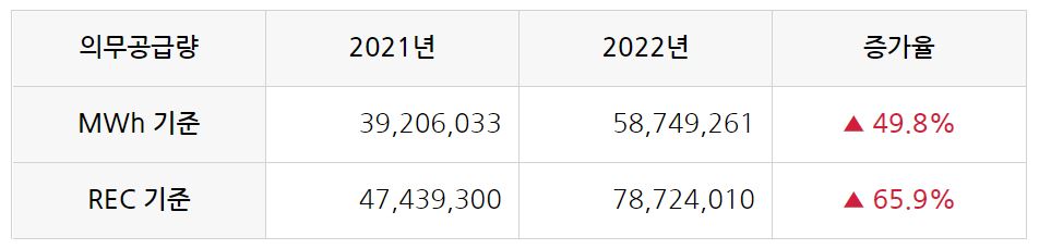 산업통상자원부 공고에 따르면, 2022년 공급의무자는 총 24개이며 의무공급량은 58,749,261MWh 및 78,724,010REC입니다. 직전년도인 2021년과 비교하면 공급의무자는 1개 늘어났으며 의무공급량은 65.9%(REC 기준) 증가했습니다.