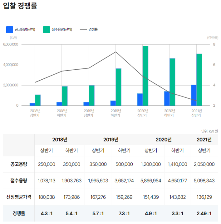 아래는 2021년 상반기까지의 공고·접수용량 및 경쟁률입니다. 이번 하반기는 전체 경쟁률 기준 역대 최저를 기록했는데요, 설비용량 기준으로 전체의 약 63%가 입찰에 선정될 수 있었습니다.