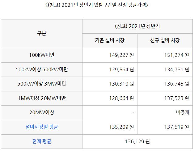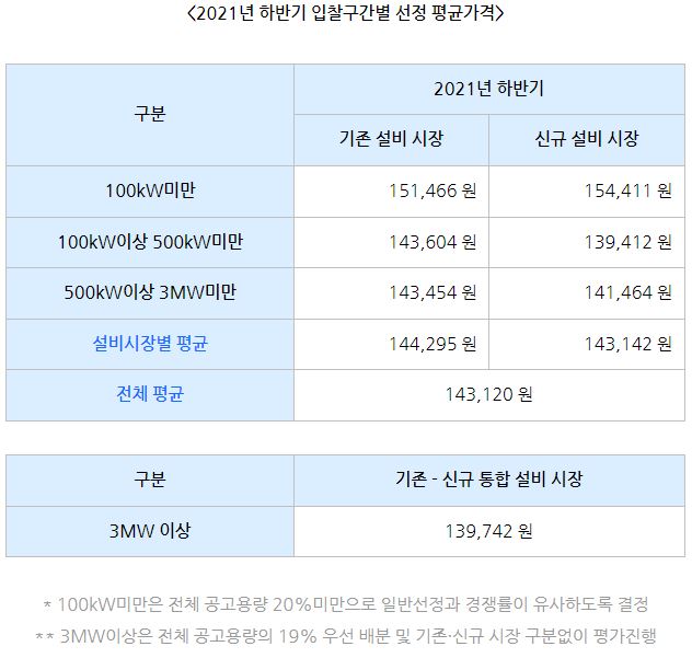 2021년 하반기 전체 평균가격은 143,120원/(SMP+1REC)이며, 지역별로 세분화하면 육지지역은 143,039원, 제주지역은 146,969원입니다. 입찰구간별 선정평균가격은 아래와 같으며, 신규 설비 시장 평균이 기존 설비 시장보다 낮다는 점이 이례적입니다.