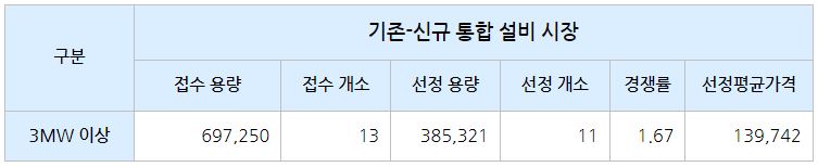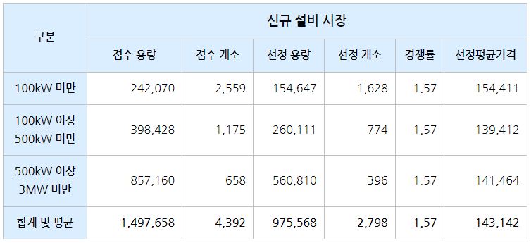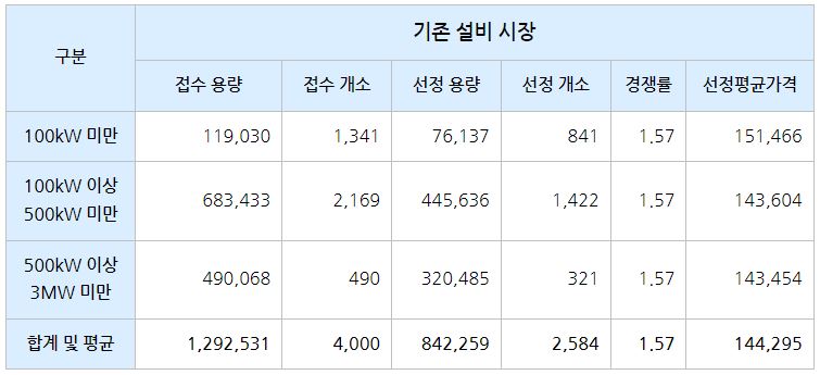 기존 – 신규 통합 설비 시장(3MW 이상)의 경우 경쟁률은 1.67 : 1, 선정평균가격은 139,742원이었습니다.