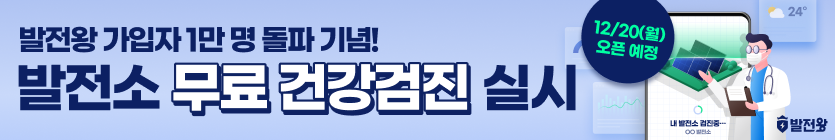 발전소 관리 마스터 발전왕은 전국 태양광 발전소 약 9,400여 개소, 설비용량 1.9GW(1,900MW)의 빅데이터를 바탕으로 발전량 비교 분석 등 발전소 운영에 필요한 서비스를 무료로 제공합니다. 12월 20일(월)부터 내 발전소의 2021년 발전시간을 맞춤 진단·분석해주는 연간보고서 무료발송 이벤트가 진행될 예정이니, 미리 발전소 등록하시고 다양한 혜택을 받아보세요!