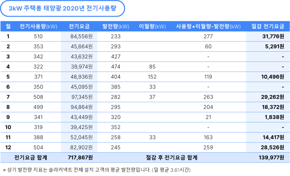 표의 데이터는 경상도와 전라도 지역에 위치한 3kW 주택용 태양광 설치 가정의 평균 전기요금을 보여주고 있는데요. 누진세 3구간을 적용받아 상대적으로 전기요금이 높은 여름철과 겨울철에도 전기요금이 크게 절감된 것을 확인할 수 있습니다. 더불어, 전체적으로도 연간 71만원대였던 전기요금이 14만원대까지 줄어들어 주택용 태양광의 설치 효과를 톡톡히 볼 수 있었죠.