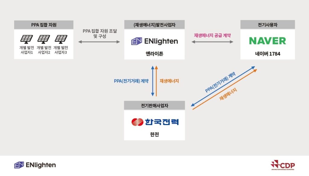 엔라이튼과 네이버의 체결 사례의 경우, 엔라이튼이 대표 발전사업자로 플랫폼을 통해 PPA 집합 자원을 모집하고 구성합니다. 이후 전기판매사업자인 한국전력을 거쳐 네이버에 전력과 재생에너지 사용확인서(Renewable Energy Gurarntees of Origin,REGO)를 안정적으로 조달합니다.