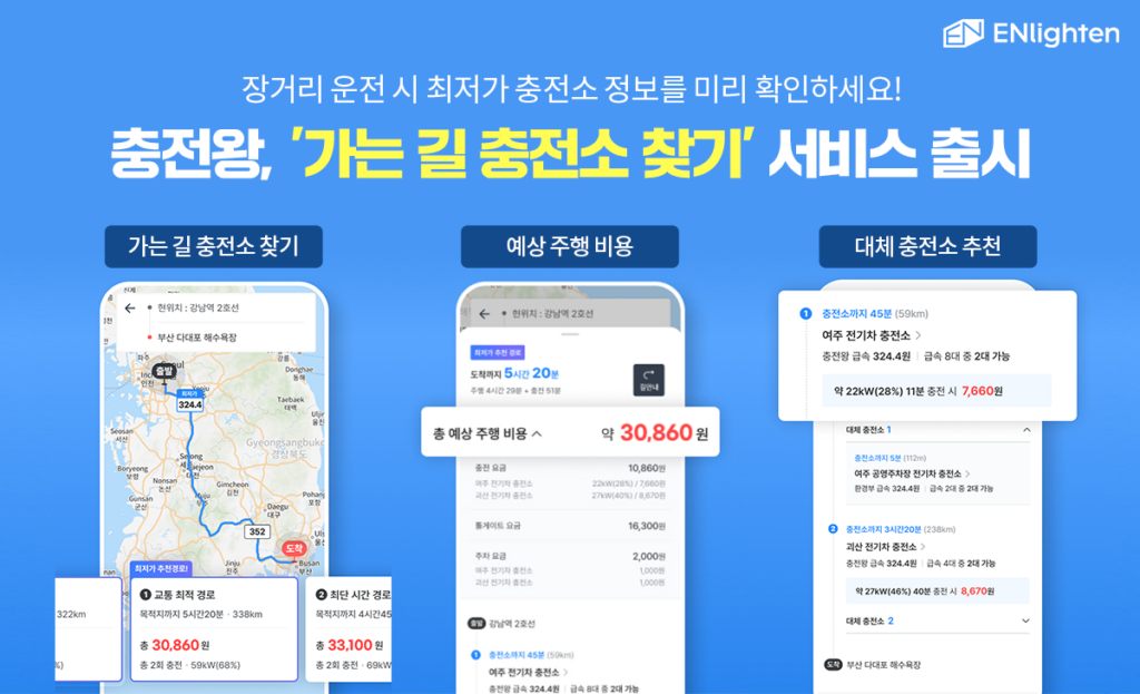 엔라이튼이 전기차 사용자를 위한 앱 ‘충전왕’에서 내 경로상 최저가 충전소 정보를 안내하는 ‘가는 길 충전소 찾기’ 서비스를 출시했습니다.