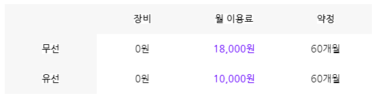 *유선 장비의 경우 45만 원 일시납으로 지불할 경우 60개월간 월 이용료는 0원입니다.