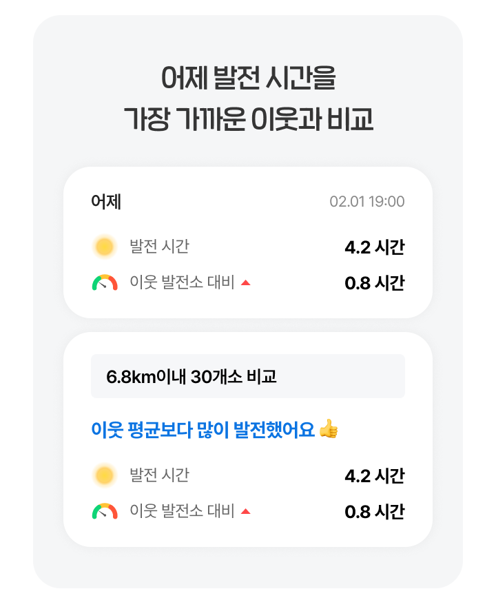 발전왕은 발전사업자가 앱 내 한 화면에서 내 발전소 상태와 관련된 대부분의 정보를 한 번에 확인할 수 있도록 지속적으로 [내 발전소] 를 개선했습니다. 여러 발전소를 보유한 고객을 위한 통합 발전량 보기, 태양광 수익 간편 확인 등 핵심 기능들이 업데이트되었습니다. 특히 발전왕에서만 제공할 수 있는 내 발전소와 가장 가까운 이웃 발전소를 비교할 수 있는 데이터 분석 기능을 추가했습니다.
