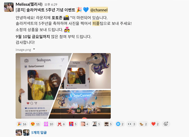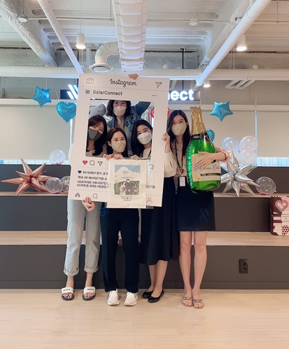 8월 말부터 라운지 한 켠에는 솔라커넥트의 생일을 축하하기 위한 포토존이 마련되었습니다. 배치된 소품들을 활용하여 재미있는 사진들을 찍고 공유하는 팀에게 소정의 상품을 드리기로 했어요.