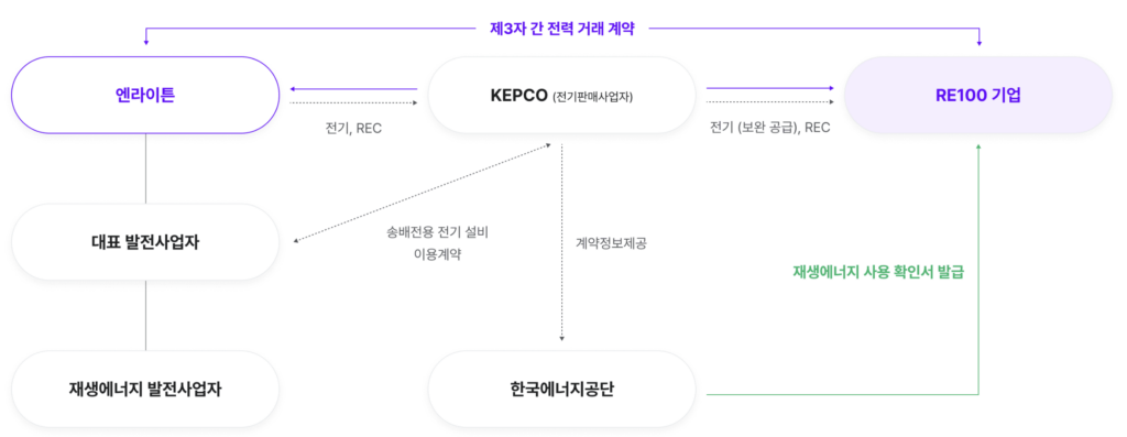 우리나라의 경우, 전력시장 특성상 PPA가 다시 제3자 PPA와 직접 PPA로 구분됩니다. 제3자 PPA는 기업과 재생에너지 발전소 사이에 중개사업자(한국전력)가 개입하는 형태로, 소매 전력 판매를 한전이 독점하는 우리나라의 특수한 구조로 인해 만들어진 제도입니다. 재생에너지 발전소는 한전에 전기를 팔고 한전이 그 전기를 RE100 기업에게 되파는 것이죠. 그러나 제3자 PPA 구조 하에서는 전력거래 중개사업자인 한국전력의 이해관계가 모순될 수 있고 따라서 한국전력이 거래에 개입할 명분이 없다는 본질적인 한계가 있습니다.