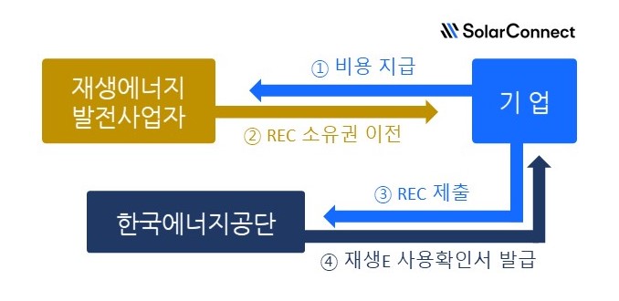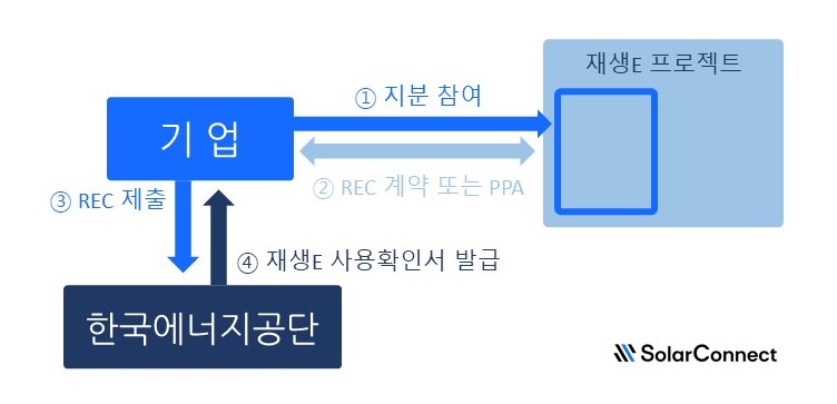 소비자(기업)는 재생에너지 발전 사업에 일정 지분을 투자하고, 해당 사업을 진행하는 발전사와 REC 계약 또는 PPA를 별도로 체결할 수 있는데요. REC 계약을 통해 구매한 REC 또는 PPA를 통해 구매한 재생에너지의 사용내역을 K-RE100 등록시스템에 제출하면 한국에너지공단의 검토를 거쳐 RE100 인증 수단으로 활용할 수 있는 재생에너지 사용확인서를 발급받을 수 있습니다.