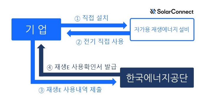 소비자(기업)는 자기 소유의 자가용 재생에너지 설비를 설치하고 생산된 전기를 직접 사용할 수 있는데요. 이후 재생에너지 사용내역을 한국에너지공단에 제출해 RE100 인증 수단으로 활용할 수 있는 재생에너지 사용확인서를 발급받을 수 있습니다.