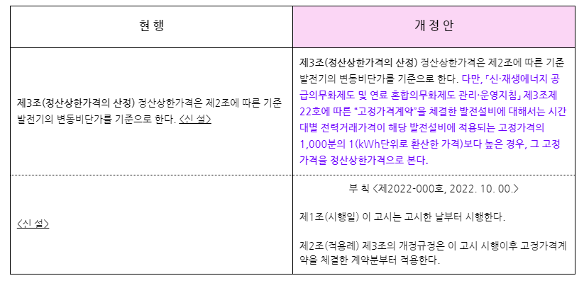 산업통상자원부, 「전력거래가격 상한에 관한 고시」 일부개정(안) 발췌