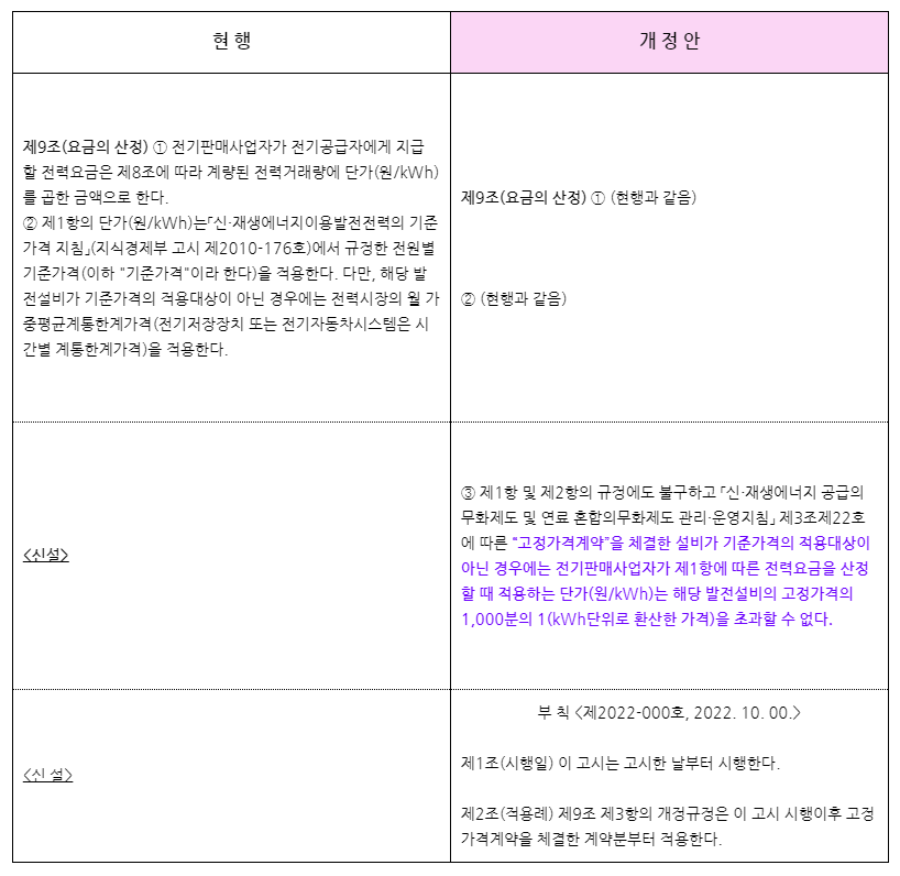 산업통상자원부, 「소규모 신·재생에너지 발전전력 등의 거래에 관한 지침」 일부개정(안) 발췌