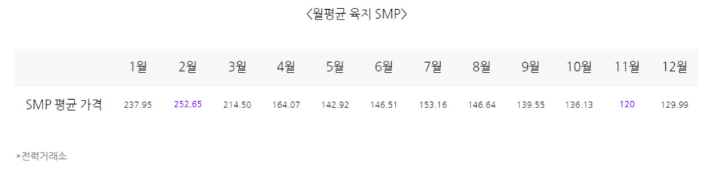 위의 그래프는 엔라이튼 홈페이지에서 제공하는 작년 한 해 동안의 월평균 SMP 동향입니다. 작년 SMP는 2월 252.65원/kWh까지 상승한 후 지속적으로 하락하여, 11월에는 2년 1개월 만에 가장 낮은 가격을 기록했습니다.