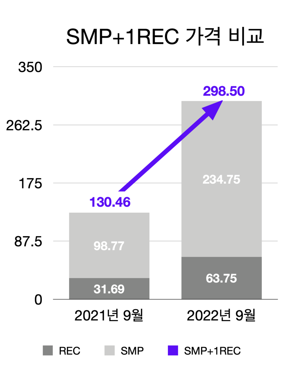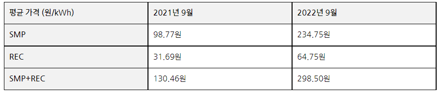 먼저 작년 9월의 경우, 육지 SMP는 평균 98.77원/kWh, 1REC는 평균 31.69원/kWh으로 SMP + 1REC = 130.46원/kWh 이었습니다. 이와 비교해 1년이 지난 현재 SMP + 1REC 가격은평균 298.50원/kWh로 무려 1.5배 이상 상승했습니다. 2022년 9월 평균 SMP는 234.75원/kWh, 1REC는 64.75원/kWh로 SMP와 REC 가격 모두 전년도에 비해 대폭 올랐습니다.