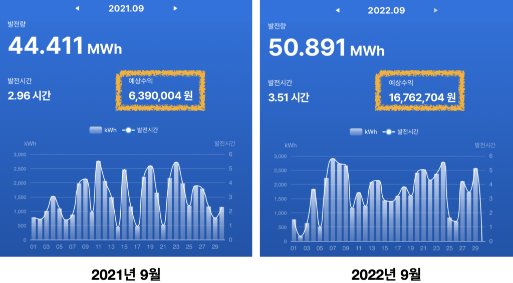 그렇다면 최근 국내에서 운영 중인 태양광 발전소의 실제 수익은 어떻게 나타나고 있을까요? 작년과 올해 9월 SMP+REC 가격을 비교한 후 ‘발전왕’ 앱을 통해 실제 수익 변화를 알아보겠습니다.