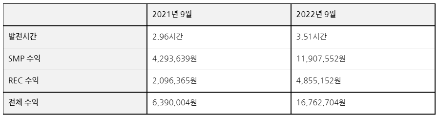 먼저 작년 9월과 올해 9월 예상수익을 비교해보겠습니다. 2021년 9월 639만원이었던 수익이 2022년에는 1천 676만원으로 올라 월 수익이 2.6배 이상 늘어났습니다. 발전시간도 0.5시간 이상 증가했지만, 근본적으로 SMP와 REC 가격의 영향도 컸던 것으로 보입니다.