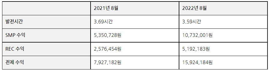 2021년 8월의 경우 월수익 792만원대였던 반면 2022년 8월에는 1천 592만원대의 높은 수익을 올렸습니다. 발전량이 비슷해도 SMP와 REC의 영향으로 월수익은 2배로 늘어난 것이죠. 종합하면 위 500kW급 발전소는 SMP와 REC의 동반 상승으로 8월과 9월 모두 1천만원 중반대의 수익을 기록했습니다.