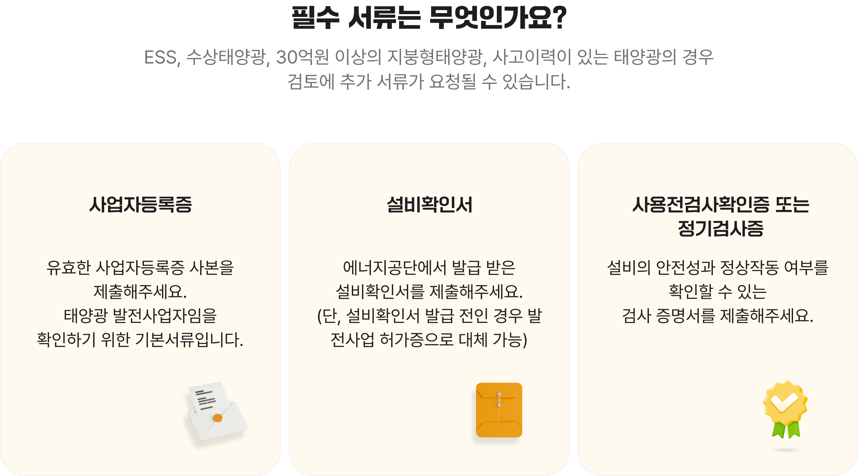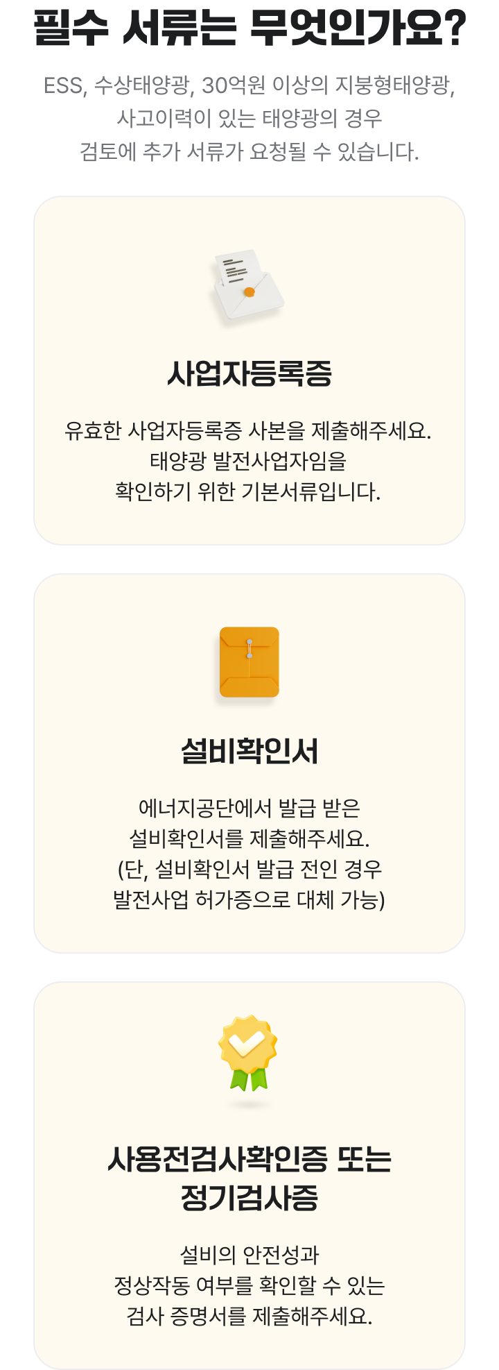 보험 가입을 위한 필수 서류는 3가지 입니다. 1) 사업자등록증 2) 발전사업허가증 3) 사용전검사확인증