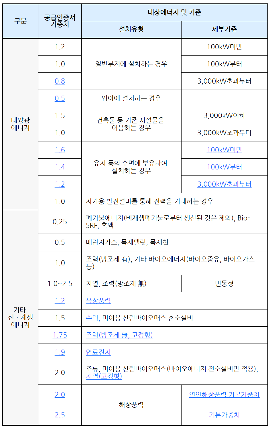 한편, 임야 태양광은 행정예고에서 발표된 것과 같이 가중치가 0.5(기존 0.7)로 하향조정되었습니다. 이외에 이번 고시로 확정된 신·재생에너지원별 가중치는 아래와 같습니다.