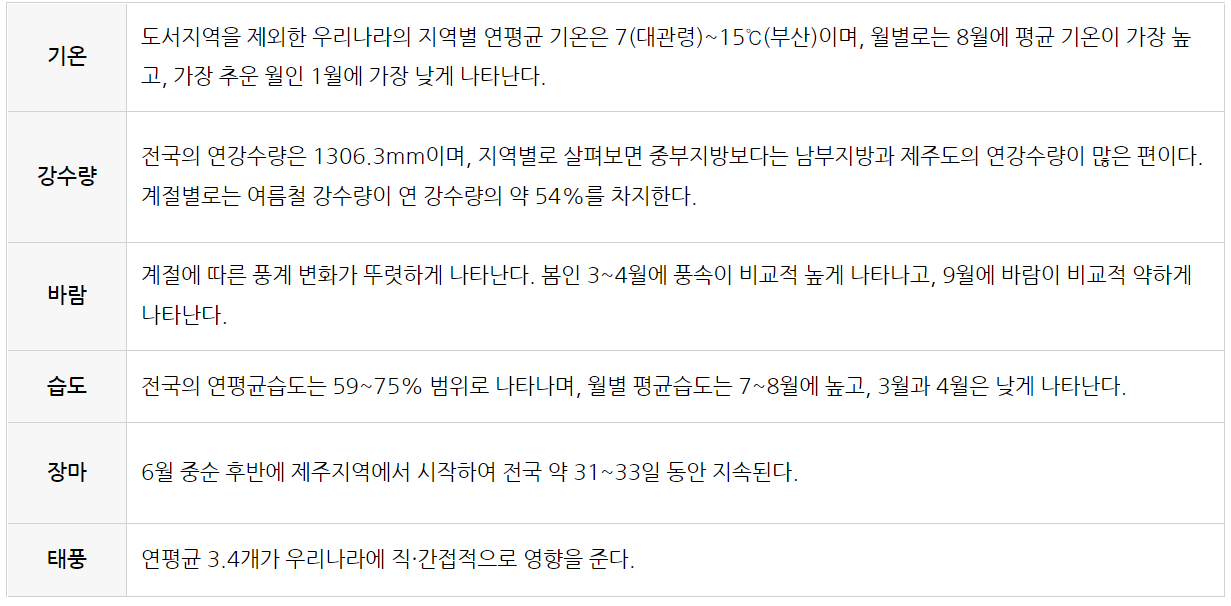 본격적으로 태양광 발전시간을 분석하기 전에 우리나라의 기후 요소를 짚고 넘어갈 필요가 있습니다. 태양광 발전시간은 일사량, 온도, 계절 등 기상조건의 작은 변화에도 영향을 받기 때문인데요. 먼저 우리나라의 기후적 특징은 다음과 같습니다.