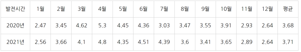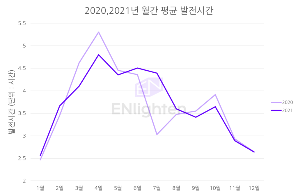 2. 2021년은 태양광 발전시간이 가장 높게 나오는 계절로 알려진 봄, 가을에 직전년도보다 낮은 발전시간을 기록했다.
