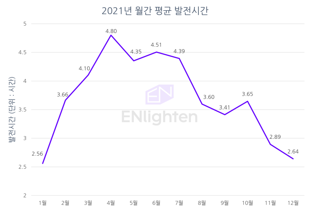 먼저 발전왕 데이터로부터 2021년 한 해동안의 월별 평균 발전시간을 보겠습니다. 평균 발전시간이 가장 높게 나타난 달은 4월(4.80시간)이었습니다. 그리고 가장 낮은 평균 발전시간을 보인 달은 1월(2.56시간)이었습니다.
