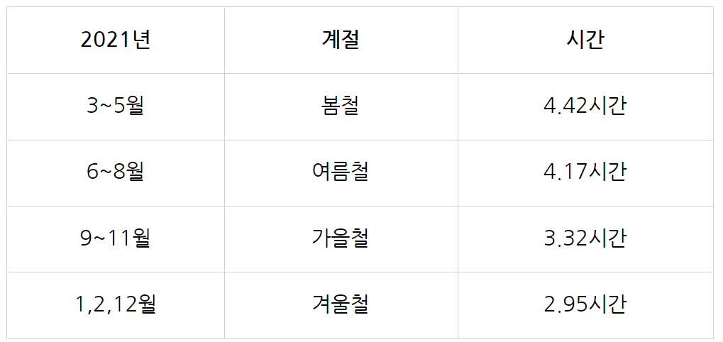 계절별로 보면 가장 평균 발전시간이 높게 나온 기간은 봄철(4.42시간)이었습니다. 이후에 여름, 가을, 겨울로 갈수록 발전시간이 떨어지는 것(4.42→2.95시간)을 알 수 있었습니다.