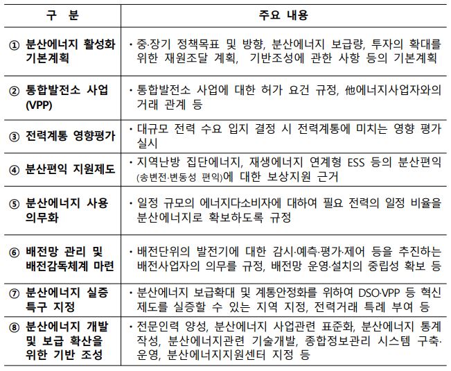한편 분산에너지 특성을 고려한 기반제도인 ‘분산에너지 활성화 특별법’도 마련될 예정입니다. 전력계통 안정화와 공급·수요의 분산화를 고려한 분산에너지 활성화를 주요 목적으로 준비된다고 하며, 주요내용(안)은 아래와 같습니다.