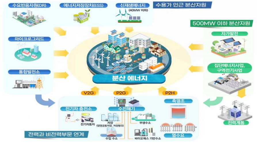 * 참고로 전기사업법상 분산형 전원의 정의는 “전력수요의 지역 인근에 설치하여 송전선로의 건설을 최소화할 수 있는 ① 40MW 이하의 모든 발전설비 또는 ② 500MW 이하의 집단에너지, 구역전기, 자가용 발전설비”입니다.