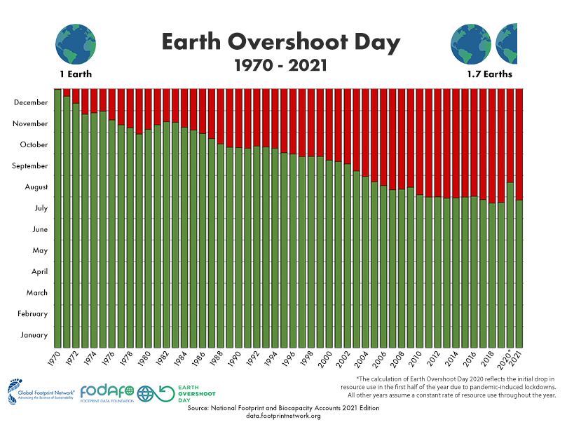 지난 1970년 이후 지구 생태용량 초과의 날은 지속적으로 앞당겨지고 있습니다. 7월 29일은 생태용량 초과의 날 계산 이래 가장 이른 시점입니다. 코로나-19가 발발한 작년(2020년), 잠시 날짜가 늦춰졌지만 곧 언제 그랬냐는 듯 원래의 추세가 이어지고 있습니다.
