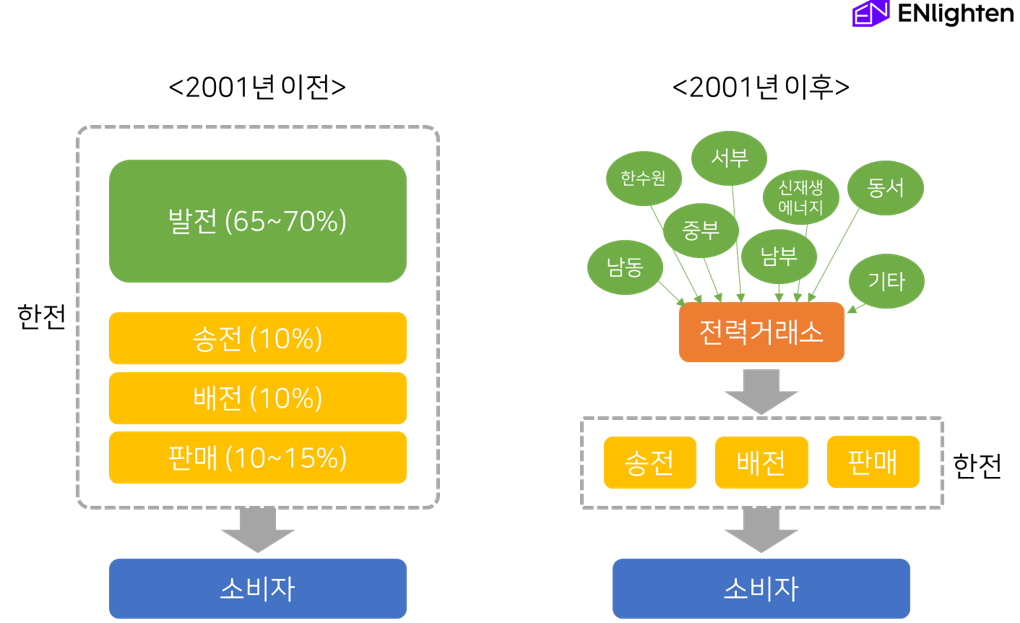 우리나라의 경우 2001년까지 위 모든 단계를 한전이 독점 운영했으나 (새탭으로 열기)”><전력산업 구조개편 기본계획(1999)>을 기점으로 ‘발전’ 부문이 한전에서 분리(민간 개방)되었습니다. 우리가 알고있듯 현재의 발전 시장은 한전 자회사, 민간기업 등 다수의 발전사업자가 분할 경쟁하는 형태입니다.