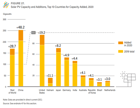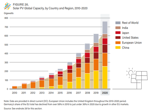 1) Figure 26, Solar PV Global Capacity, by Country and Region, 2010-2020, REN21 Secretariat, Renewables 2021 Global Status Report, p.119, https://www.ren21.net/wp-content/uploads/2019/05/GSR2021_Full_Report.pdf.