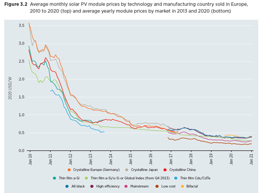 7) Figure 3. “Average monthly solar PV module prices by technology and manufacturing country sold in Europe,” IRENA (2021), Renewable Power Generation Costs in 2020, International Renewable Energy Agency, Abu Dhabi.