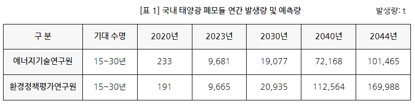 통상 태양광 폐모듈의 수명주기가 20년~25년라고 하나, 기술발전속도와 발전효율 향상에 따른 교체수명주기를 고려할 때 15~20년을 잡는 경우도 있다. 이러한 수명주기와 보급량을 고려하여, 2030년에는 국내 태양광 폐모듈 발생량이 약 2만톤 가량으로 예측된 바 있다. 3)